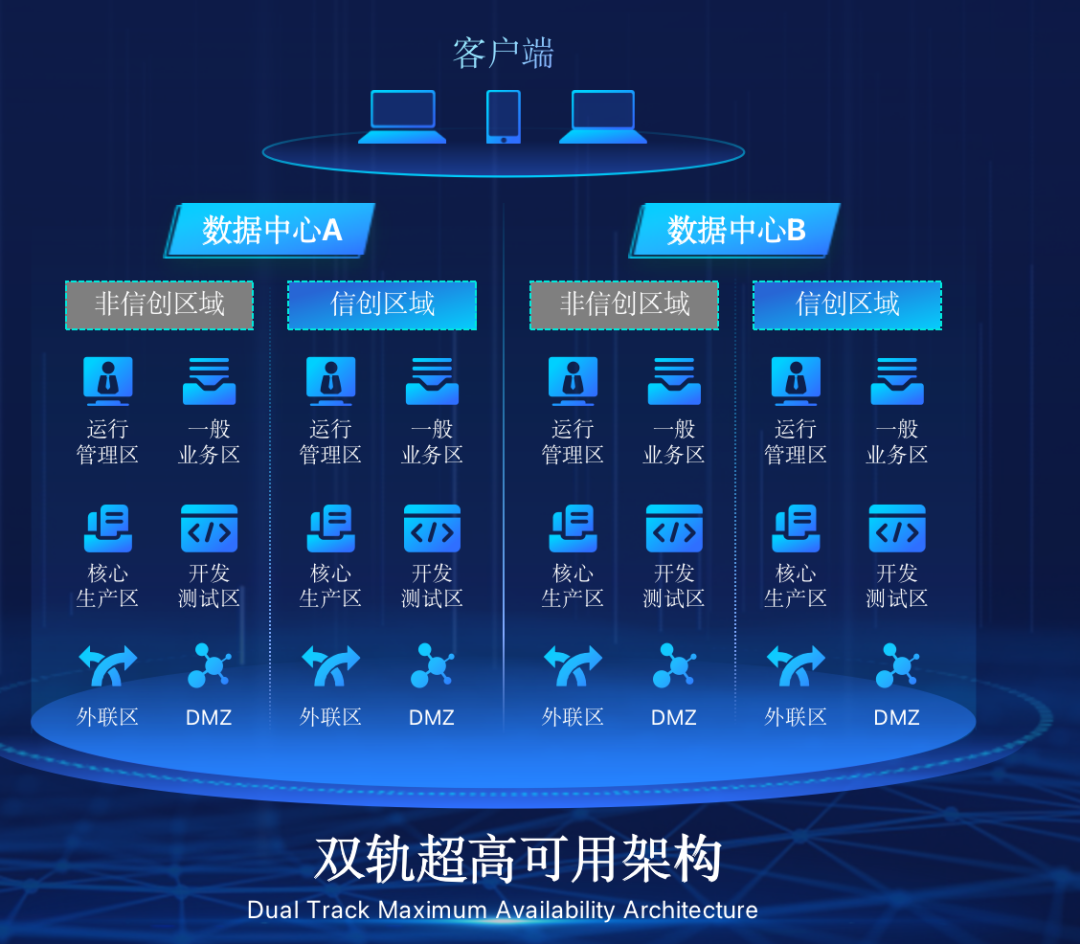 JIUYOU.COM-九游在企业面临自主创新IT基础重构过程中,推出的全新架构双轨超高可用架构(简称DTMAA),在双活数据中心的分区调度基础上,添加每个数据中心内信创域和非信创域的分域调度,来实现分区分域协同的多活双轨超高可用。